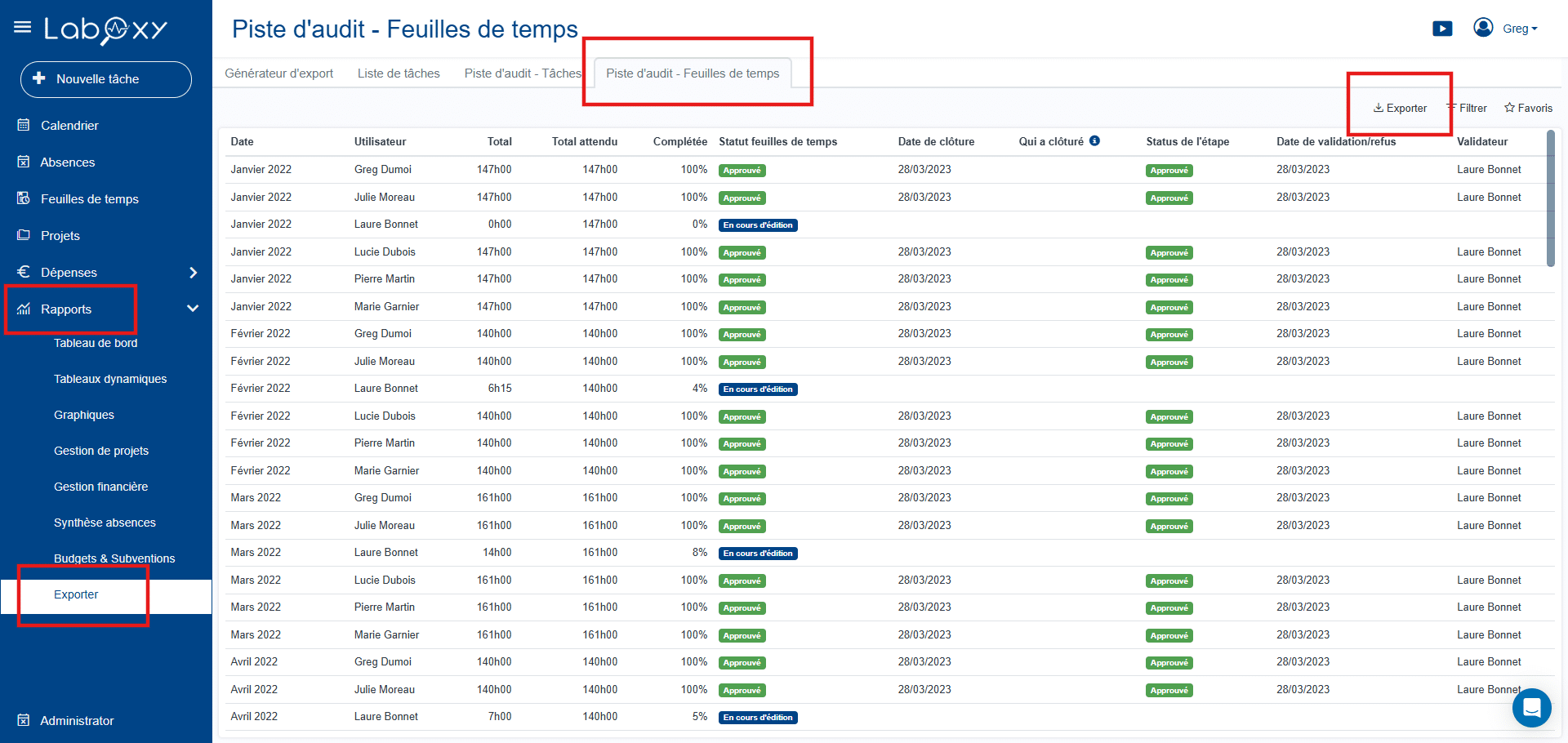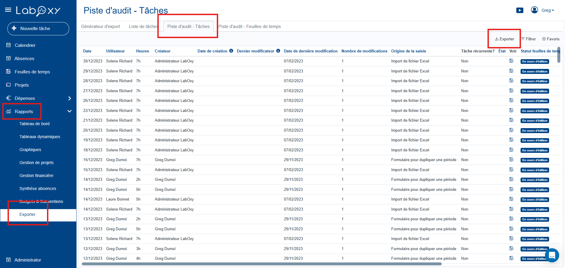 Vous retrouverez les pistes d’audit dans le menu “Rapports >> Exporter”, puis dans les 2 nouveaux onglets “Piste d’audit – Tâches” et “Piste d’audit – Feuilles de temps”. L’export se fait traditionnellement avec le bouton en haut à droite “Exporter”.